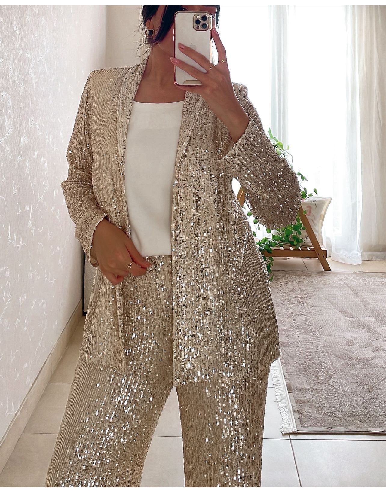 Елегантен костюм от пайети, сако с шал яка и клош панталон. Перфектен за новогодишното парти!