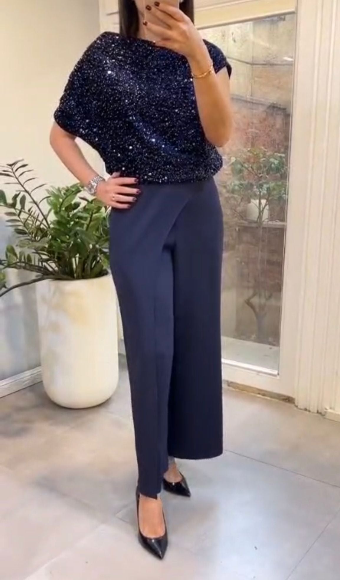 Елегантен тоалет от две части, блуза с пайети с открити ръкави и елегантен панталон с цепка и асиметрична кройка. Ще обърнеш всички очи!