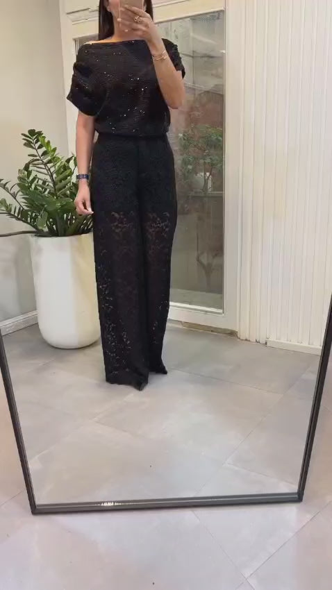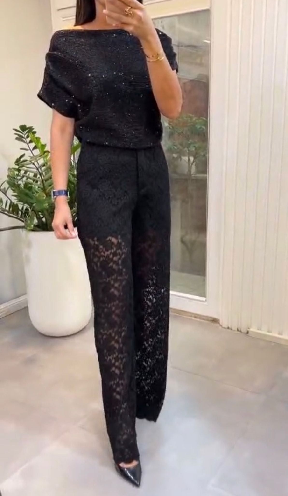 Елегантен тоалет от две части, блуза с пайети с открити ръкави и широки дантелени панталони. Ще обърнеш всички очи!