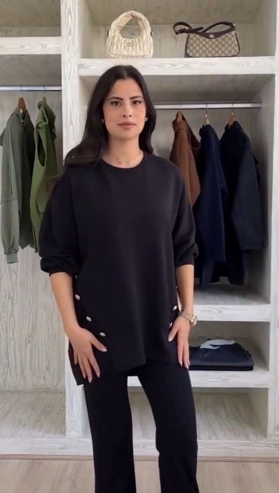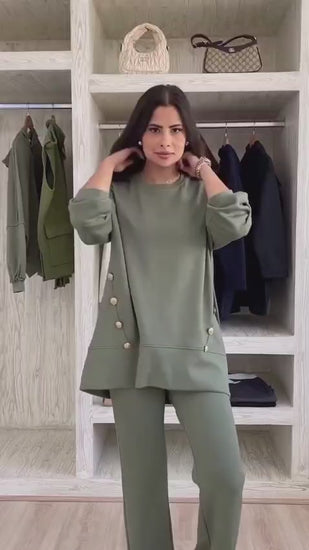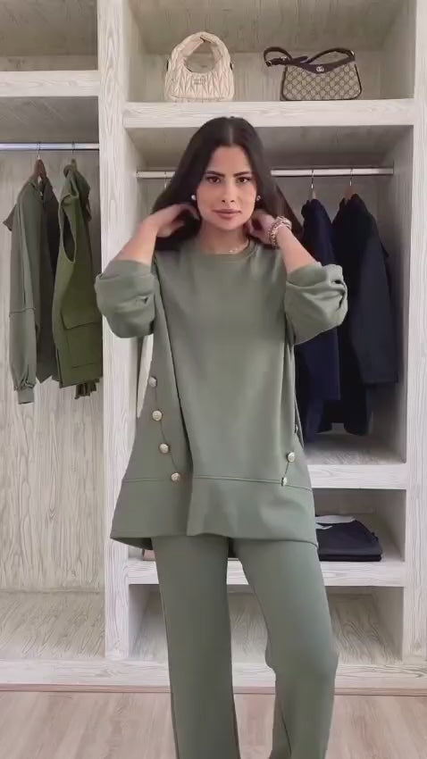 Спортен комплект от две части, включващ широк панталон и блуза с асиметрична дължина – по-къса отпред и по-дълга отзад. Моделът е акцентиран с контрастни копчета както на блузата, така и на панталона, които придават стилен и модерен завършек. Подходящ за ежедневно носене и комфортна визия.