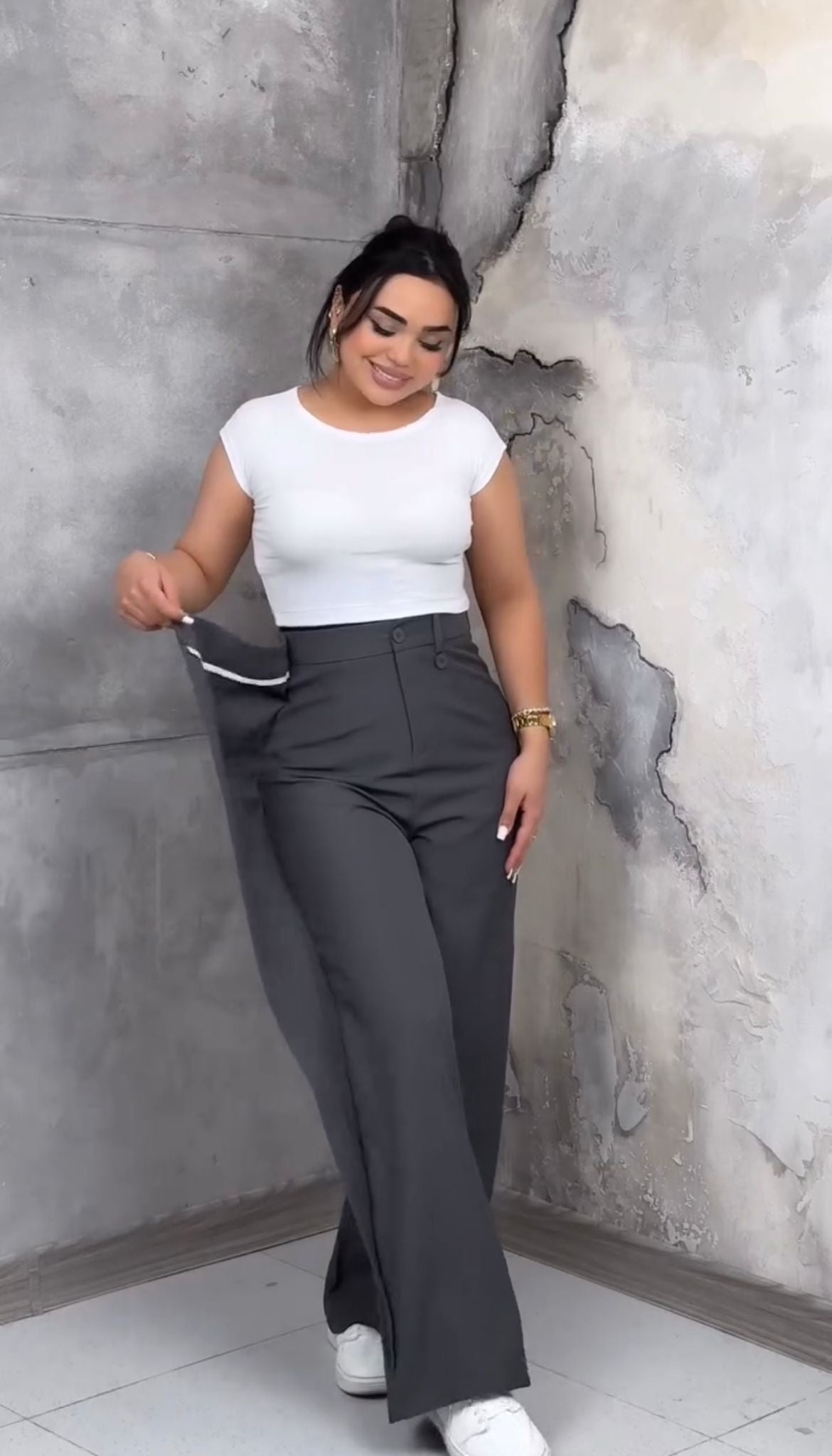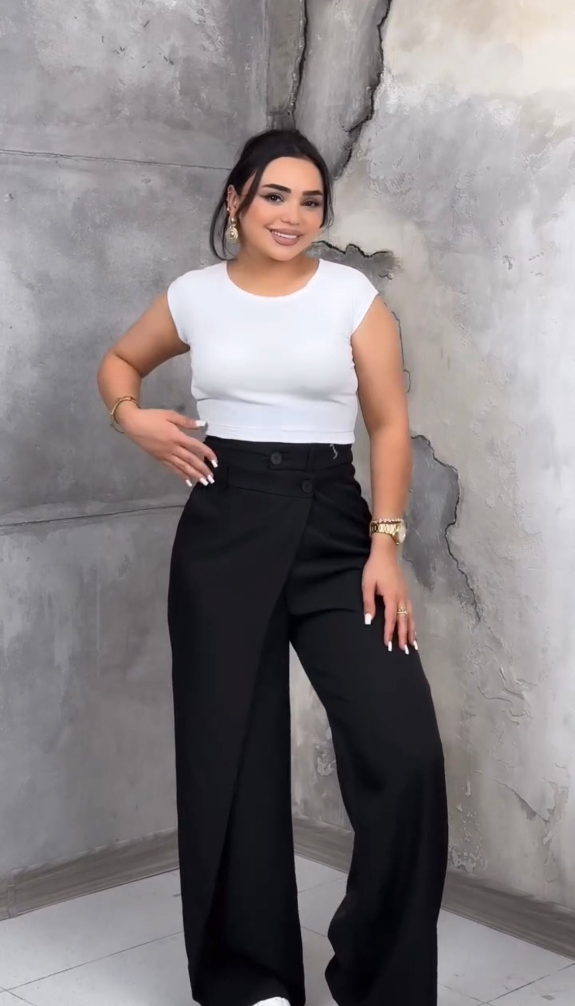 Широк панталон с двойна талия и асиметрично двойно закопчаване. Перфектен за облекло, което ще ви извади от анонимността!