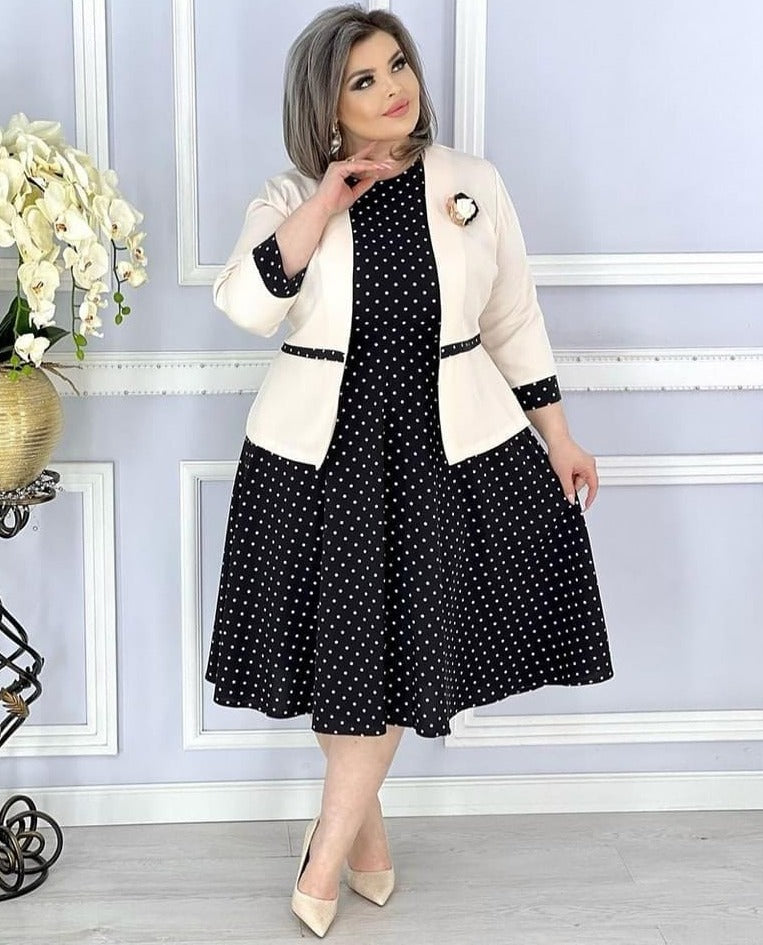 Елегантен костюм със сако и широка рокля. Якето е без закопчаване и без подплата, с акценти в контрастни нюанси. Роклята е широка, затваря се със скрит цип.