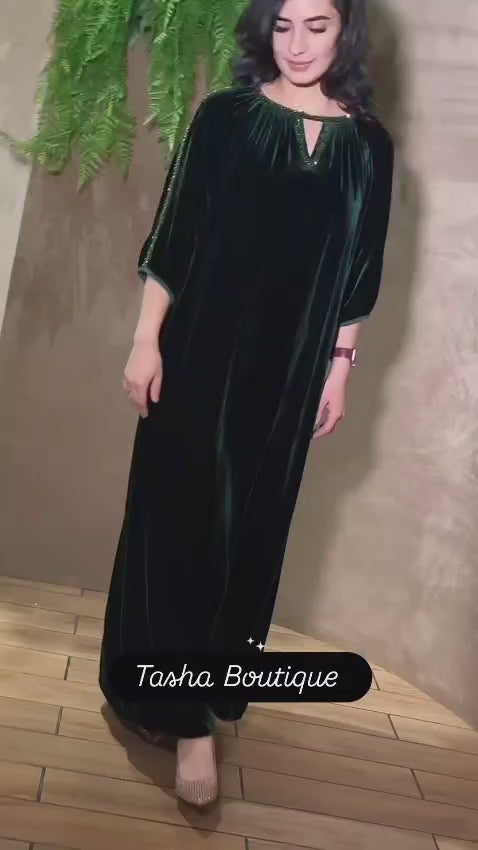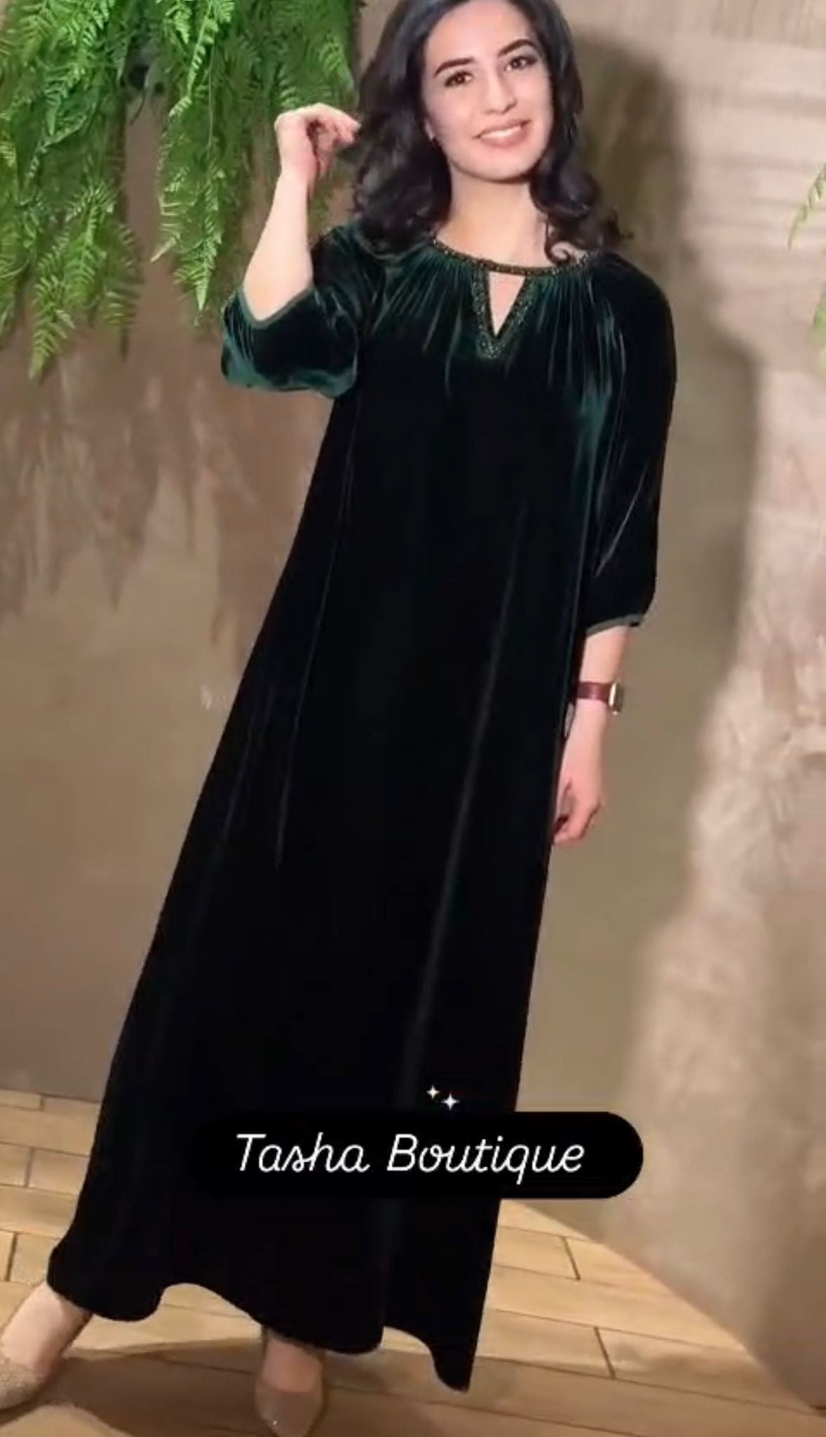 Елегантна кадифена рокля с аксесоари около деколтето и ръкавите. Подходяща рокля за всеки повод.