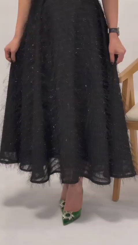 Елегантна рокля с широка пола и елече с волани, изработена от материя със специална леко лъскава нишка. Това е рокля, подходяща за всеки повод.